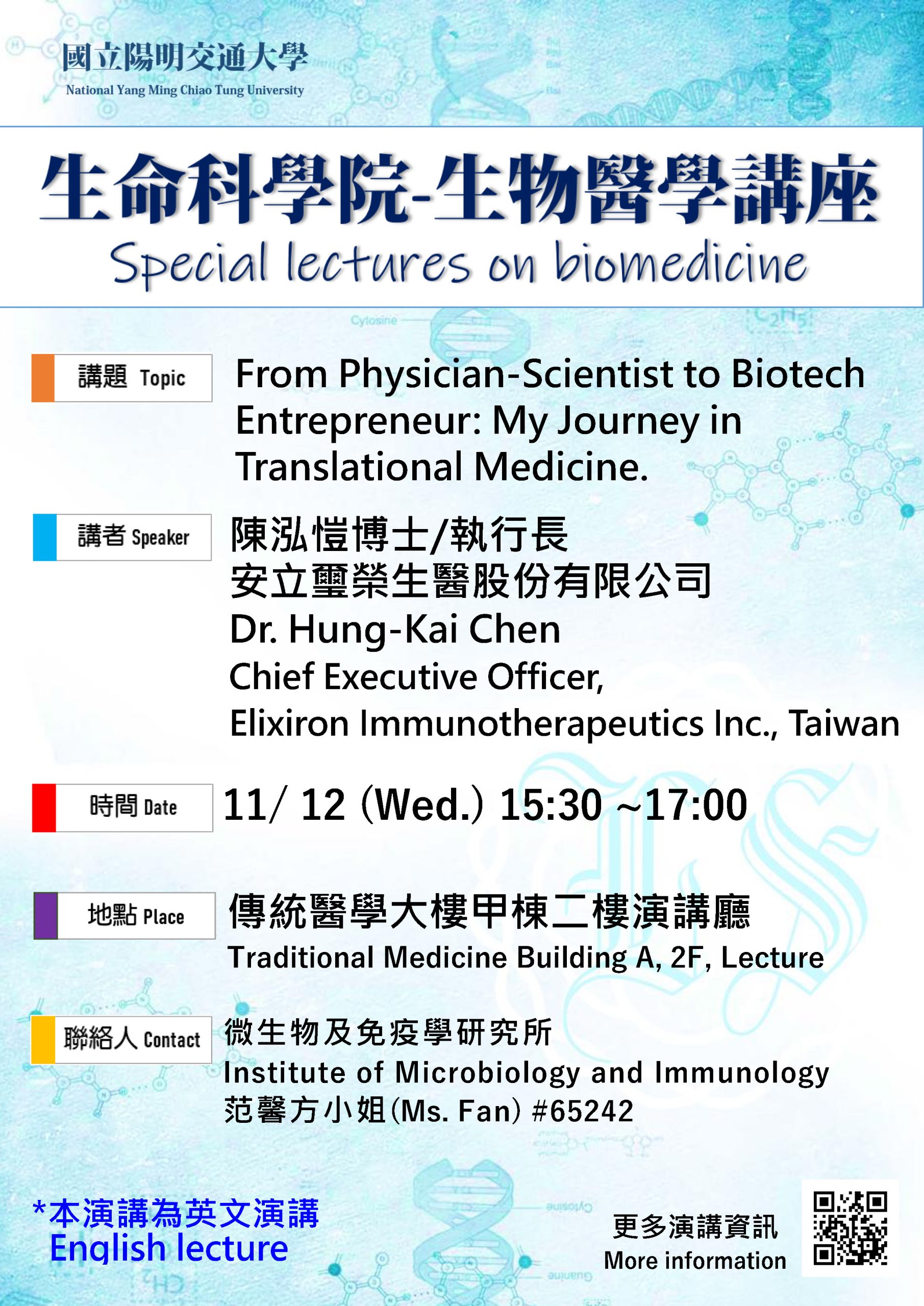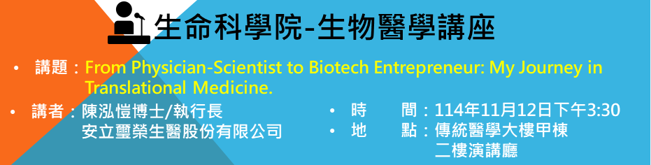 11月12日生物醫學講座將邀請安立璽榮生醫股份有限公司陳泓愷博士/執行長蒞臨分享🗣,演講資訊如下,歡迎各位老師和同學前來聆聽!