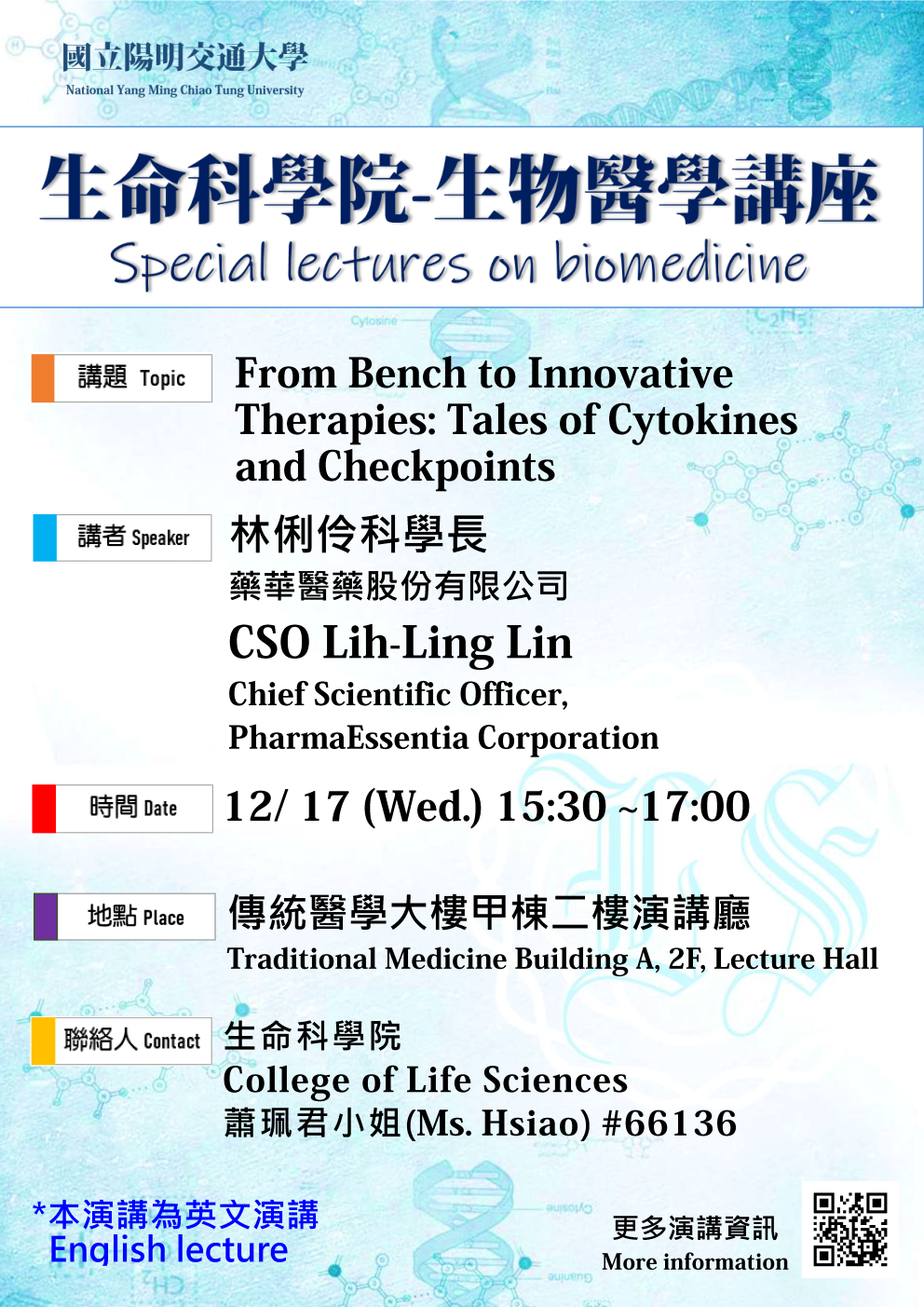 Please be reminded that only two sessions remain for this semester’s Special lectures on biomedicine( 12/10 and 12/17). Students who have not yet attended or have not met Institute/ Department’s grade requirement are advised to take this opportunity to to join the upcoming lectures!