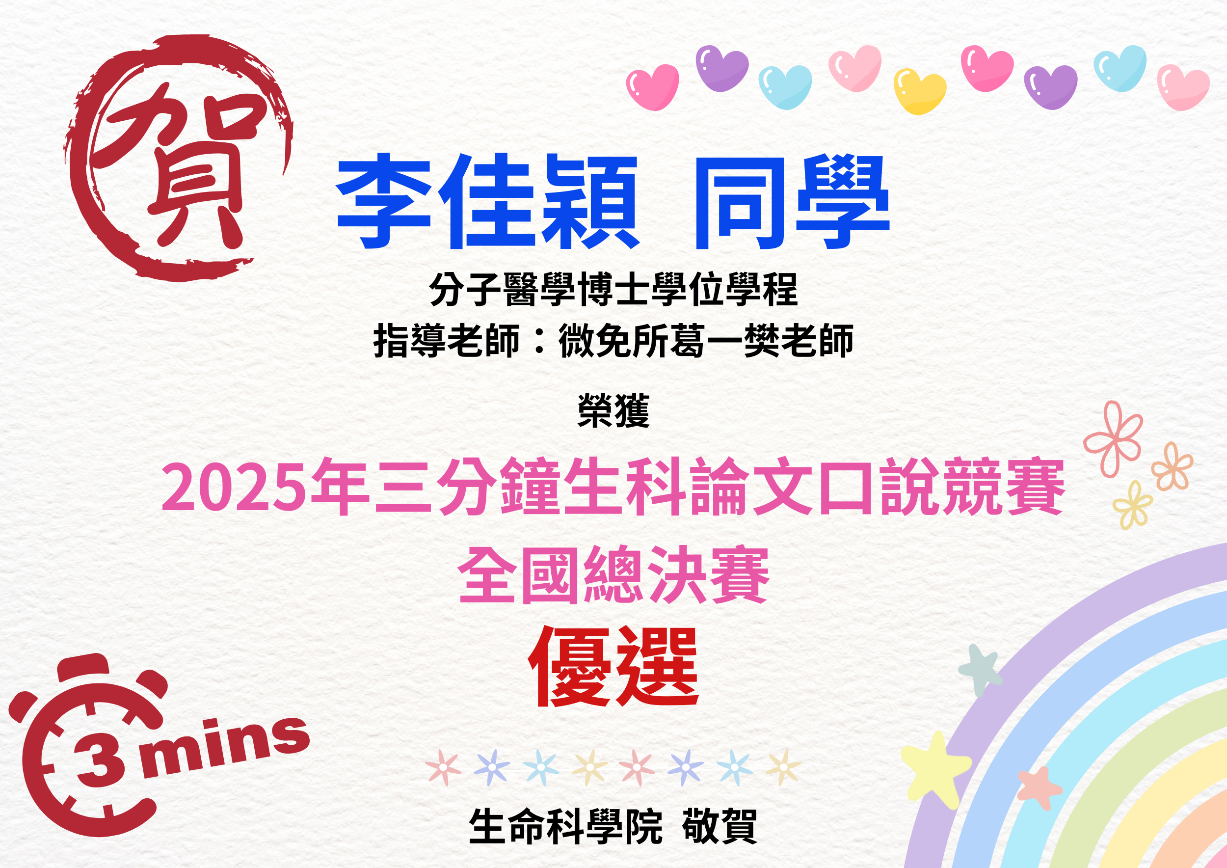 🎉恭賀本院分子醫學博士學位學程李佳穎同學參加2025年三分鐘生科論文口說競賽全國總決賽榮獲優選!