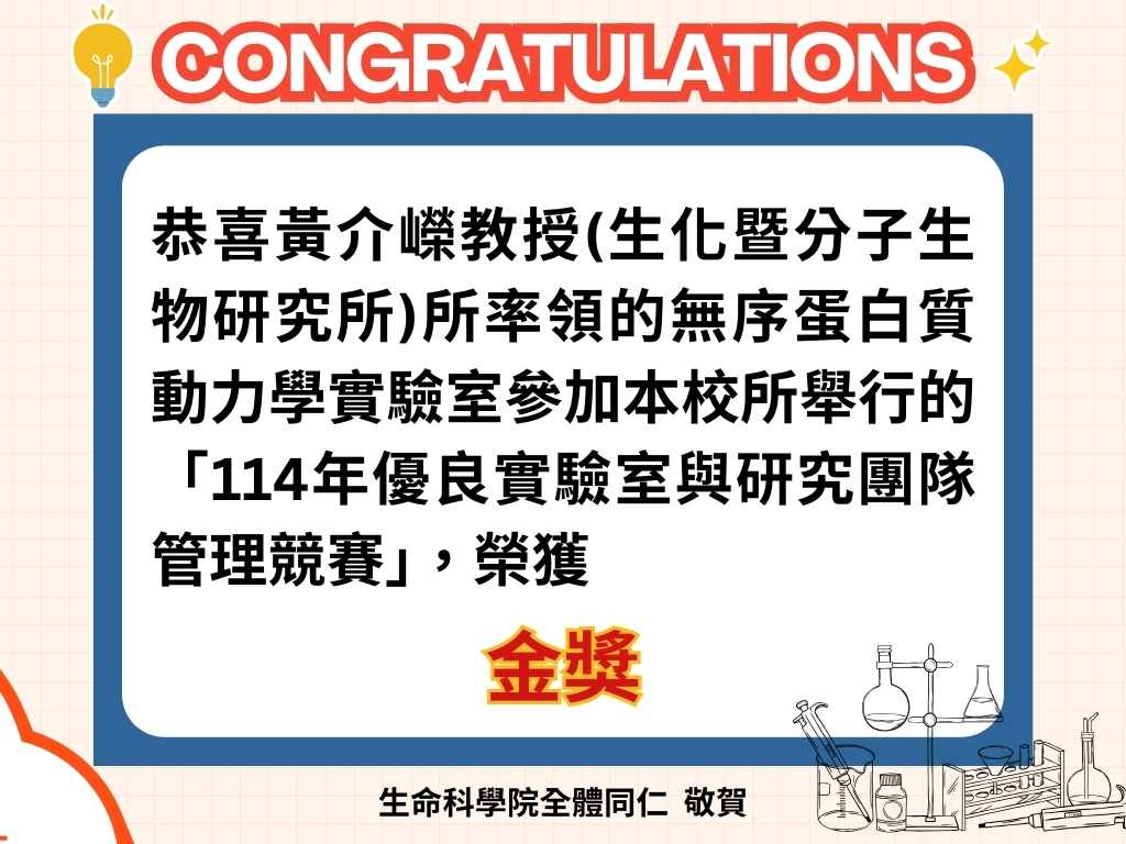 cls66136 12 月, 週五, 2025 最新消息 , 榮譽 恭喜本院生化所黃介嶸教授所率領的無序蛋白質動力學實驗室參加本校「114年優良實驗室與研究團隊管理競賽」,榮獲「金獎」! 恭喜本院生化暨分子生物研究所黃介嶸教授所率領的無序蛋白質動力學實驗室參加本校所舉行的「114年優良實驗室與研究團隊管理競賽」,榮獲「金獎」的肯定,真是可喜可賀! Comments 0