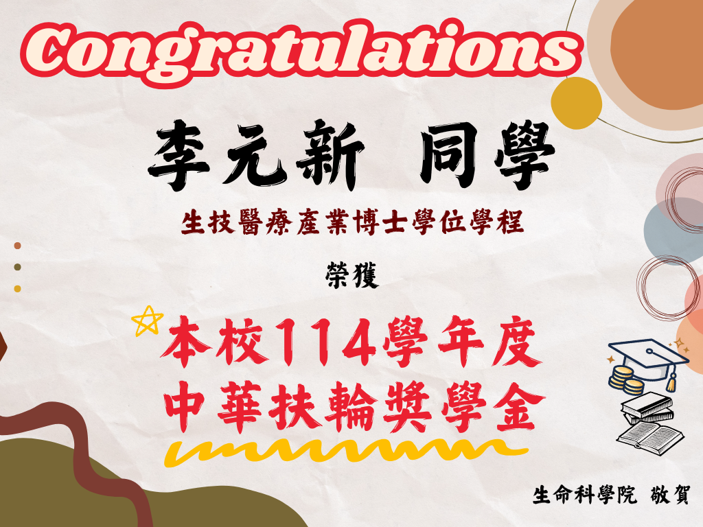 cls66136 12 月, 週二, 2025 最新消息 , 榮譽 恭賀生醫產博學程李元新同學榮獲本校114學年度中華扶輪獎學金 恭賀本院生技醫療產業博士學位學程李元新同學榮獲本校114學年度中華扶輪獎學金,同學優異的表現獲得肯定,真是太棒了~ Comments 0