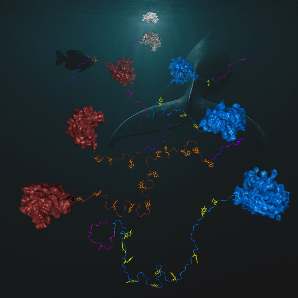 脊椎動物體內那些帶有無結構區段(intrinsically disordered regions, IDRs)的半乳糖凝集素(galectin),為了透過「液-液相分離」機制來凝集抓取糖分子,演化出了一套策略。生化所黃介嶸老師實驗室分析了所有物種帶有IDR的galectin,並實驗比對了斑馬魚與人類的,發現雖然大家偏好提供結合力的「貼紙」胺基酸種類不同(例如,魚類偏愛tryptophan、哺乳類喜好tyrosine),但演化並不糾結於優化單一貼紙的強度,而是Crtl+C/Crtl+V直接複製貼上這些模組序列來疊加黏性。面對複雜的生理需求,蛋白質的IDRs選擇「以量取勝」,從一個小小的模組出發,最終也可以趨同演化出凝集的功能(插圖的背景由AI生成)。