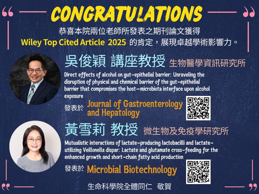 恭喜本院生醫資所吳俊穎講座教授和微免所黃雪莉教授所發表之期刊論文獲得Wiley Top Cited Article 2025的肯定!