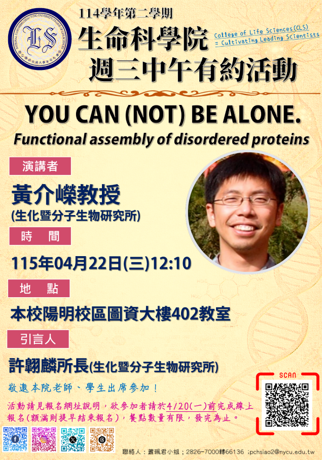【週三中午有約】4/22黃介嶸教授,講題:YOU CAN (NOT) BE ALONE. Functional assembly of disordered proteins